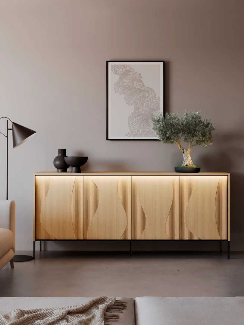 Legg til kontrast i hjemmet med FLOW skjenk! Unik design i kombinasjon med vincenza eik flater, så lekkert!